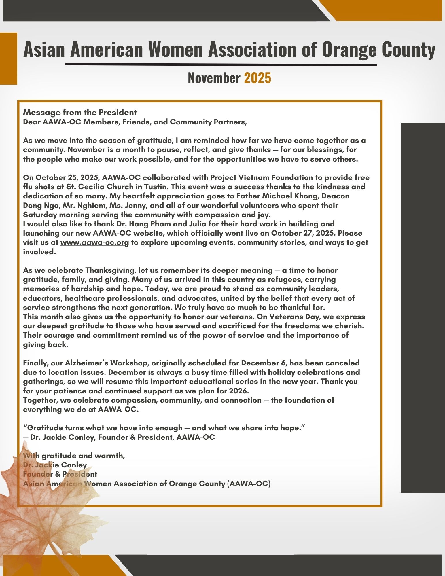 Stay connected with the heart of our organization through our newsletters. Each issue highlights upcoming events, member achievements, community initiatives, and important updates from the Asian American Women Association. Explore our latest editions to stay informed, inspired, and engaged with the work we continue to build together.